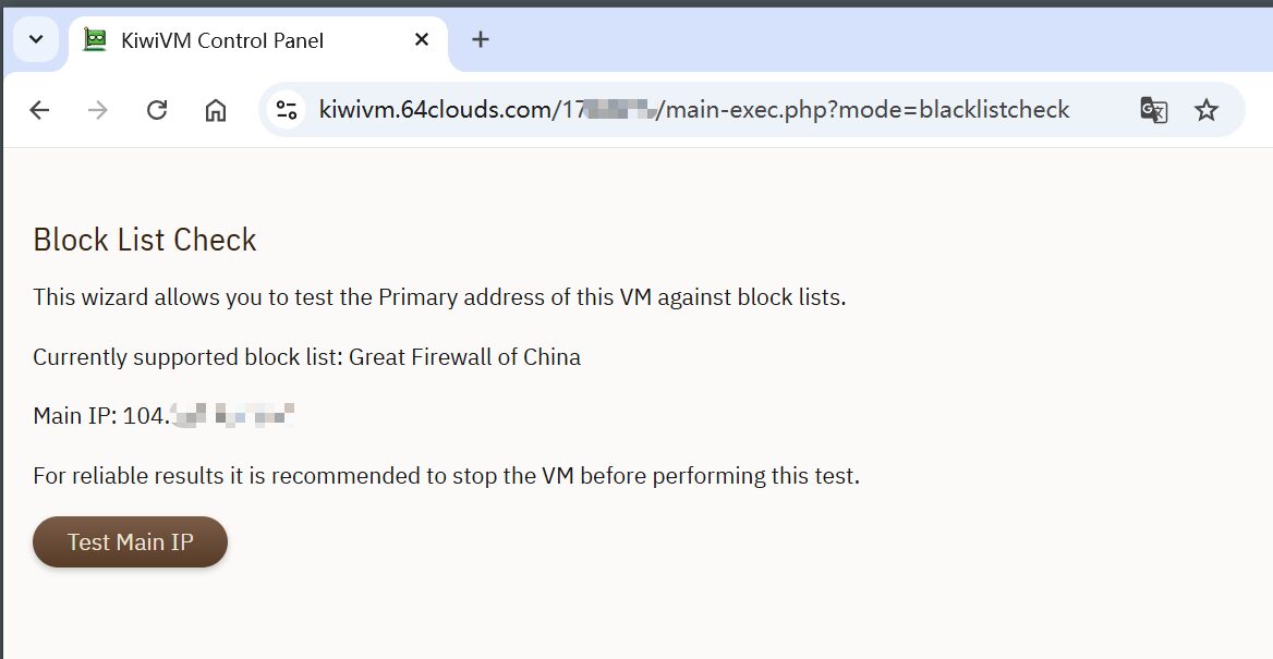 这个页面是 KiwiVM 控制面板中的「Block List Check(封锁列表检测)」工具,主要用于判断你的 VPS 主 IP 是否被列入封锁名单。