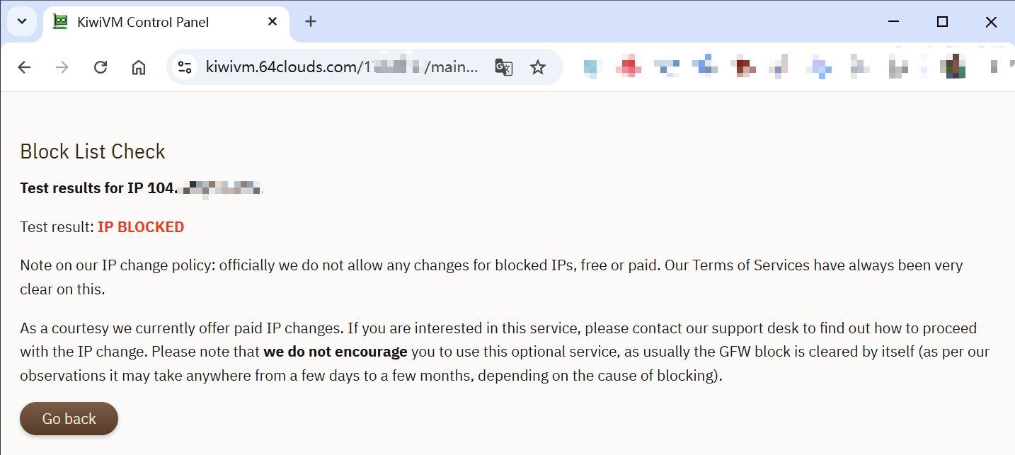 - KiwiVM 提供了官方的 GFW 封锁检测工具